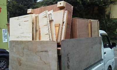 使用済みタイルカーペット約700枚と、輸入梱包木箱でした。スタッフ2名、2トン車、軽トラで訪問して完了しました。