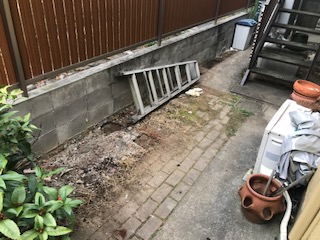 磯子区森周辺の戸建てにお住いのT様からメールにて裏庭の不用品の片付けと回収のご相談を頂きました。処分品は古い物置、ブロック約30個、ガラス板、釣り具、プランター類で物置は大きいサイズのため解体が必要だと想定しました。