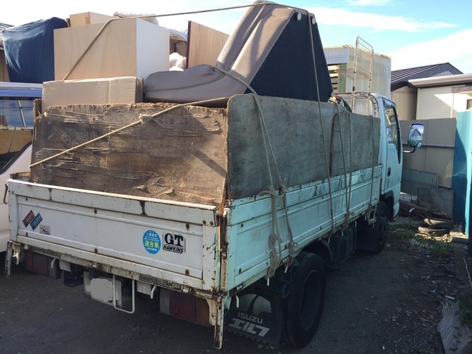 お電話にて訪問5日前に不用品回収のお問合せいただきました。6日後に引越しをするので引越しの前日の訪問希望でした。内容はエアコン(取外し作業こみ)、冷蔵庫、洗濯機、衣装ケース、椅子、本棚、ミニテーブル、照明器具、テレビ台、チェストでした。 単品よりもお得な軽トラ満載便をお勧めしてご納得いただきました。 訪問日は次のお客様の訪問があったので軽トラではなく、1トン車で訪問しました。お客様より追加で布団、作業机、その他45リットル袋のなどの追加があり荷台が満載になりました。